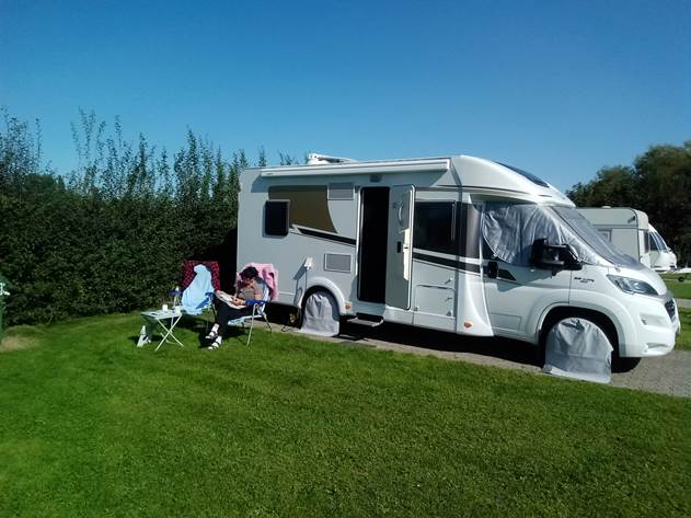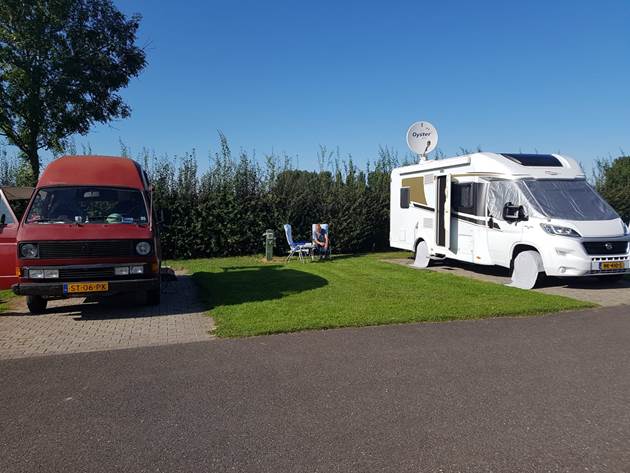 de camper op de mooie camperplaats in het zonnetje. In de middag