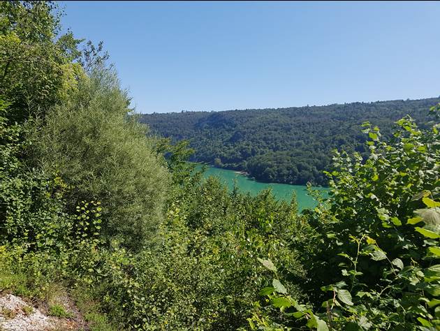 blauwe meer van lac de Vouglan. We fietsen door langs het meer naar